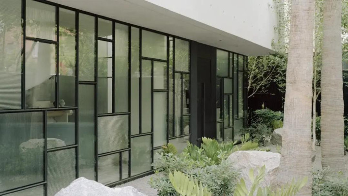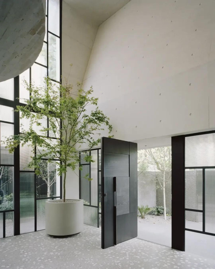 混凝土的坚实与玻璃的明净,构成了这座建筑的外立面。它被绿意环抱,却自成一格,气质卓然。大面积的留白设计,既削弱了建筑的厚重感,也为内部空间蒙上了一层神秘面纱,激发着人们无尽的遐想。