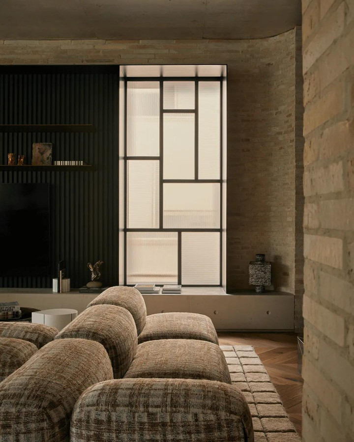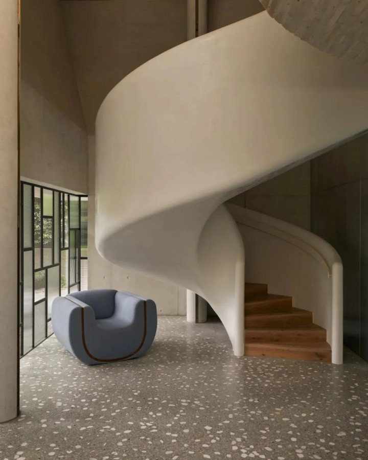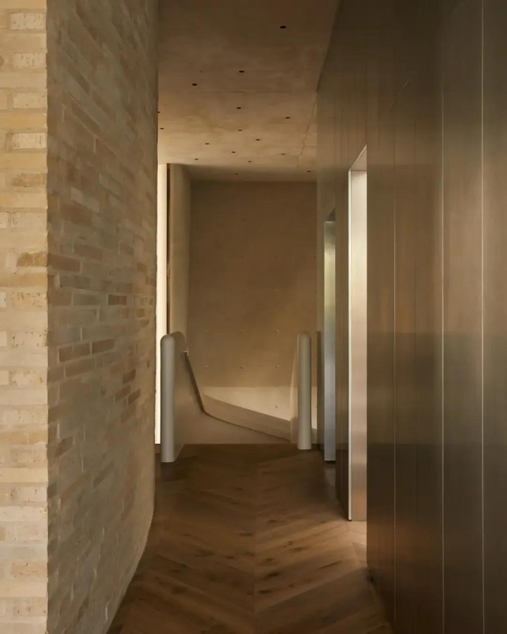 一层空间的设计,以美术馆为蓝本,营造出高而敞亮的氛围。核心是一座现浇混凝土的弧形楼梯,其形态与裸露的砖墙、几何分割的彩色玻璃墙面形成有趣的互动。地面采用胡桃木人字拼图案,与一件大型石制艺术装置相映成趣。整个空间在原始的材质张力与现代的精致细节之间,找到了完美的平衡点。